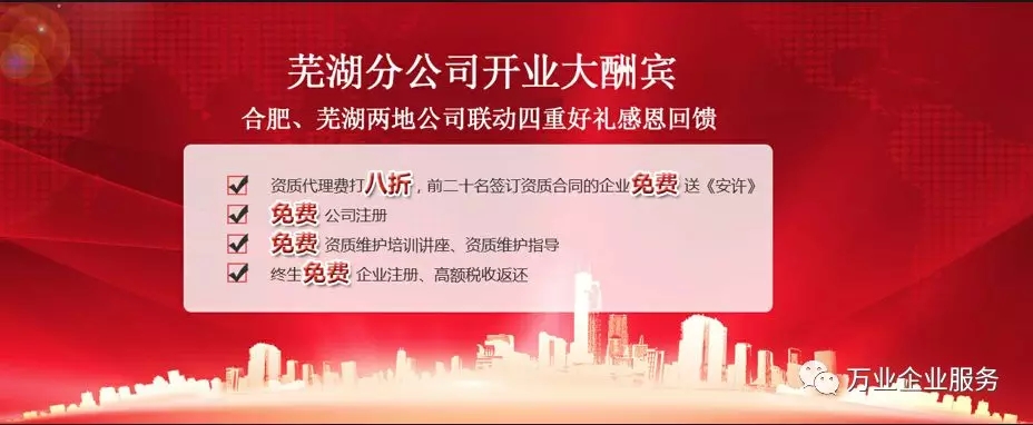 說到這里怎么能少得了優惠活動呢 福利時間到! 為了感謝大家長期以來一直對本司的支持 特推出開業大酬賓活動 合肥、蕪湖兩地公司聯動四重好禮感恩回饋!! 免費福利 1 資質代理費打八折,前二十名簽訂資質合同的企業免費送《安許》 2 免費公司注冊 3 免費資質維護培訓講座、資質維護指導 4 終生免費企業注冊、高額稅收返還 說了這么多,快跟隨小編一睹新公司的風采吧! 開分公司對于我們來說是挑戰也是機遇,挑戰在于外部環境,機遇在于面對挑戰我們仍然能夠快速處理并且不斷自我優化。現分公司需要做的就是充分發揮我們的優勢,希望在這座城市里能夠做出更好的成績來回饋大家。謝謝大家長期以來的支持,安徽萬業才能更好的成長為大家提供更優質的服務!我們相信,蕪湖分公司這艘滿載著希望的巨輪,定能乘風破浪到達成功的彼岸!