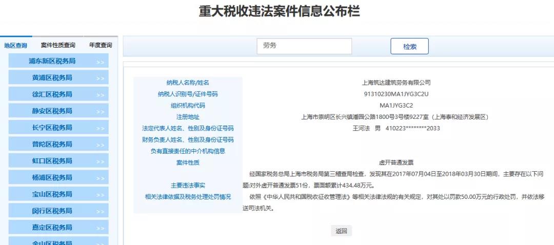 2、上海XX建筑勞務(wù)有限公司,經(jīng)國家稅務(wù)總局上海市稅務(wù)局第三稽查局檢查,發(fā)現(xiàn)其在2017年07月04日至2018年03月30日期間,主要存在以下問題:對外虛開普通發(fā)票51份,票面額累計434.48萬元。依照《中華人民共和國稅收征收管理法》等相關(guān)法律法規(guī)的有關(guān)規(guī)定,對其處以罰款50.00萬元的行政處罰,并依法移送司法機關(guān)。