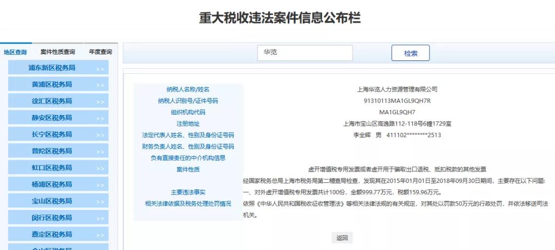 4、上海XX人力資源管理有限公司,經(jīng)國家稅務(wù)總局上海市稅務(wù)局第二稽查局檢查,發(fā)現(xiàn)其在2015年01月01日至2018年09月30日期間,主要存在以下問題:對外虛開增值稅專用發(fā)票共計100份,金額999.77萬元,稅額159.96萬元。依照《中華人民共和國稅收征收管理法》等相關(guān)法律法規(guī)的有關(guān)規(guī)定,對其處以罰款50萬元的行政處罰,并依法移送司法機關(guān)。