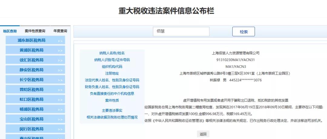 5、上海XX人力資源管理有限公司,經(jīng)國家稅務(wù)總局上海市稅務(wù)局第二稽查局檢查,發(fā)現(xiàn)其在2017年06月19日至2018年09月30日期間,主要存在以下問題:對外虛開增值稅銷項發(fā)票100份,金額996.98萬元,稅額169.49萬元。依照《中華人民共和國稅收征收管理法》等相關(guān)法律法規(guī)的有關(guān)規(guī)定,已作出稅務(wù)行政處理決定,并依法移送司法機關(guān)。