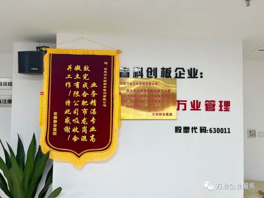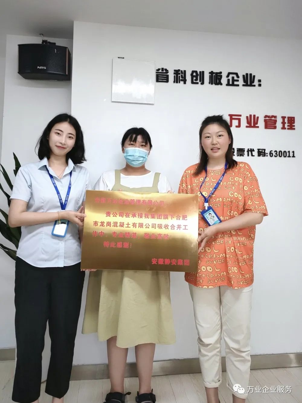 5月26日,安徽靜安集團為安徽萬業·中天衡送來一面錦旗和一塊牌匾。其集團代表負責人說:“真是太感謝了,要不是萬業中天衡的鼎力幫助,高效的完成了合肥市龍崗混凝土有限公司吸收合并工作,我們的業務也不會開展的如此順利!”